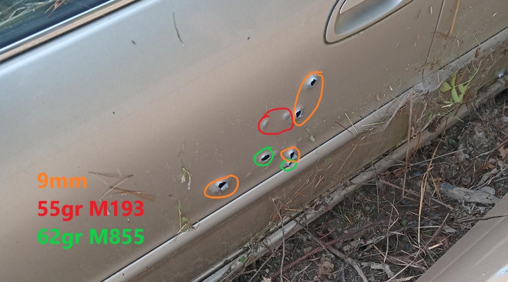 - 124gr 9mm: punched through both doors, deflected off of the pillars and trunk area