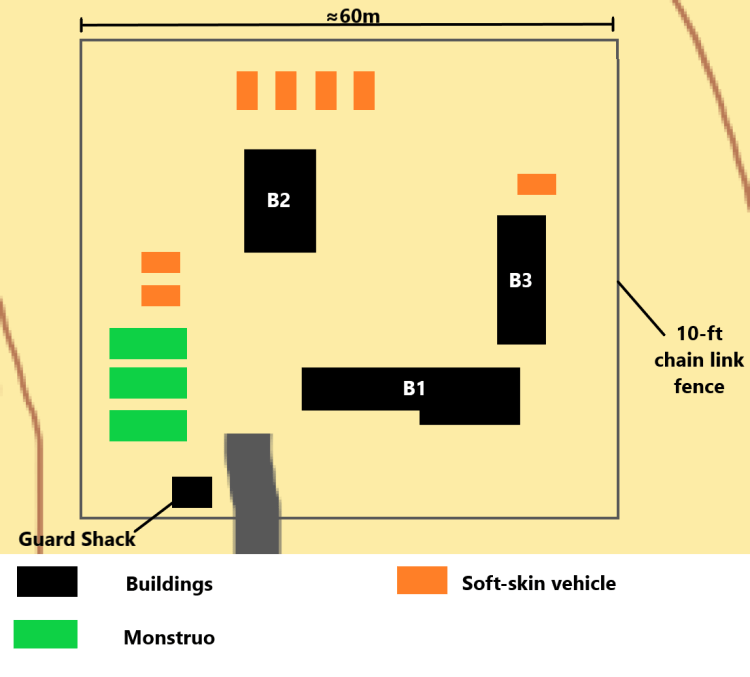 “Due to the size of the objective, we cannot hit every vehicle from a single firing point. The AMR team is the main effort and will be located South-East of the objective where they can engage the Monstruos. Team 2 will split off and take up an attack by fire position on the North-East side of the objective to engage the remaining soft-skin vehicles with their rifles. Team 1 will be our security element watching the road, located no more than 100m from the AMR team. I will be located with the AMR team where I can observe the objective.