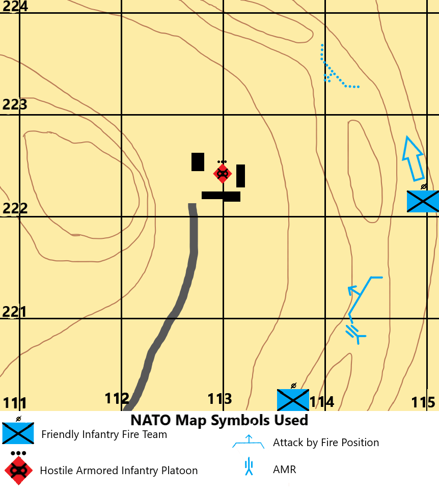 “Gentlemen, we will depart for this raid at 4pm. Enemy troops on the objective greatly outnumber and out-gun us, so we will not attempt an assault. Instead, we will conduct an Attack by Fire from 400m away. The Anti-Materiel Rifle (AMR) will disable the Monstruos with 2 API rounds to each engine, and then put 1 round into the engine block of every other vehicle that they see.”