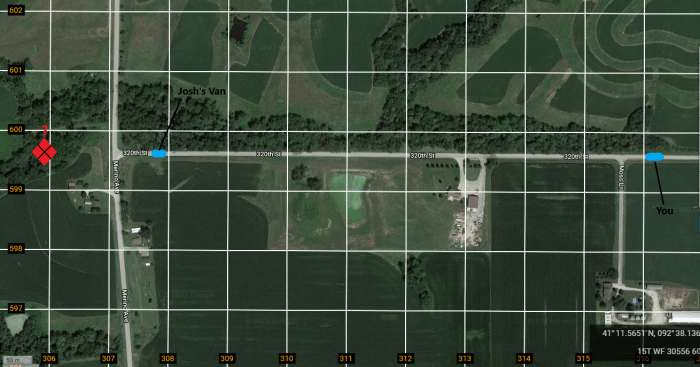 On the way home you are heading West along 320th St approaching a planned right turn onto Merino Ave. Suddenly you hear a crackle of gunfire ahead, and you see Josh’s van come to a halt about 75m short of the intersection. You tell your driver to halt the vehicle, and order the rest of your squad to dismount and set security. You hear the occasional snap and whine of ricochets whistling past you from very far ahead.